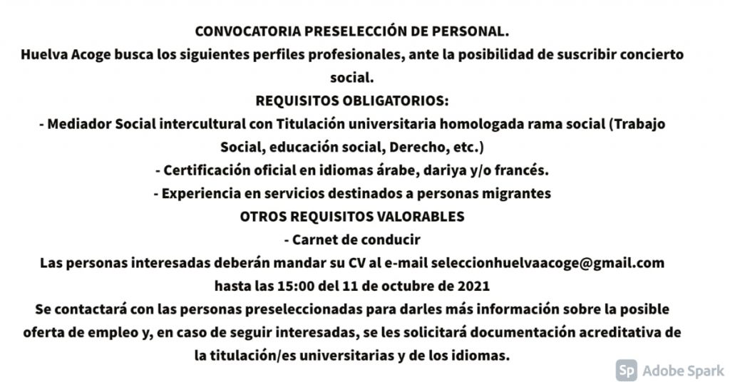 Interesados enviar CV al email seleccionhuelvaacoge@gmail.com